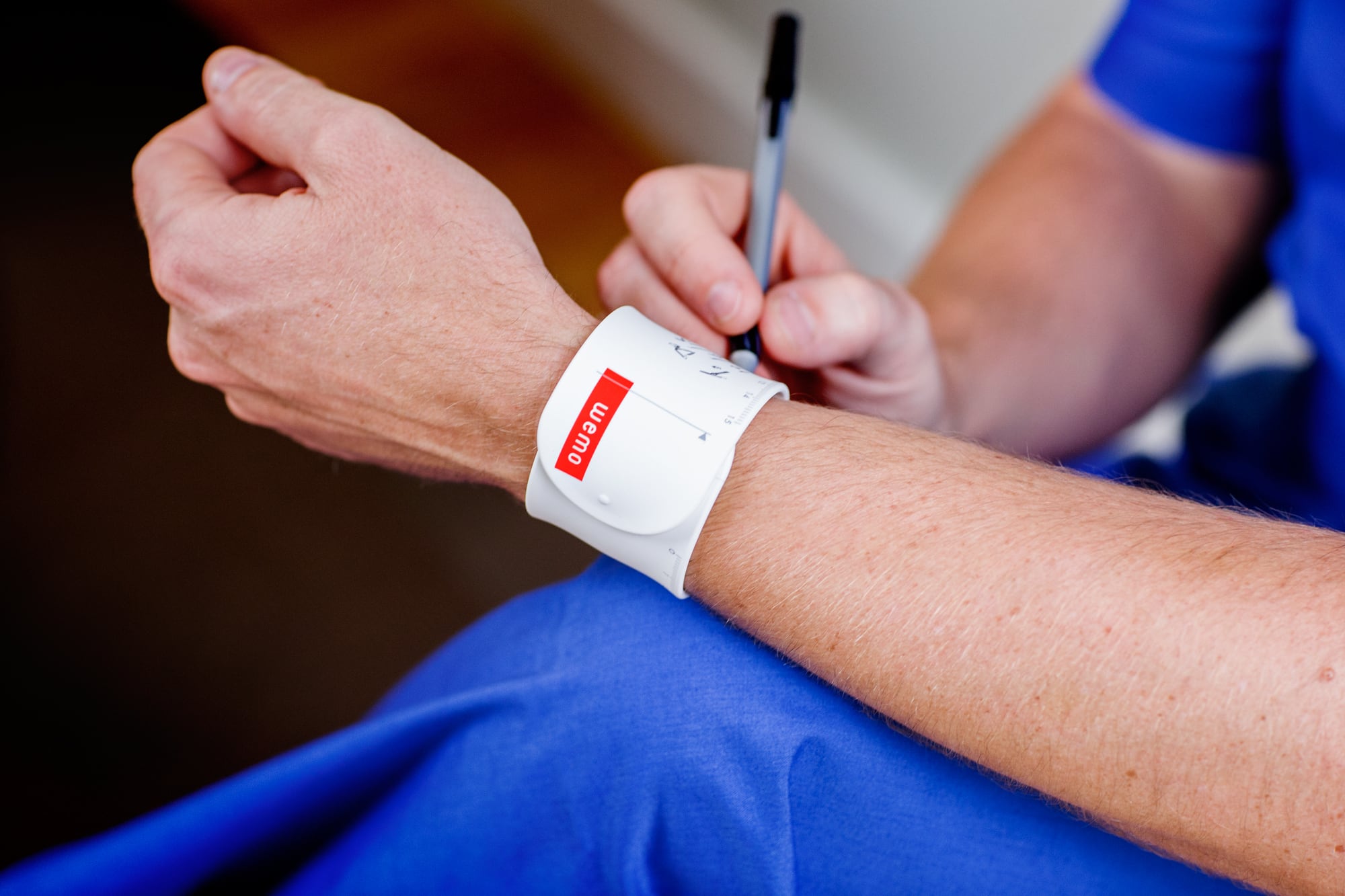 ・腕に巻き付けて使用するシリコンバンドタイプのウェアラブルメモです。油性ボールペンで書いて、指や消しゴムで擦って消すことができます。
